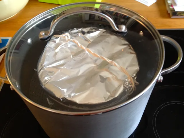 Cover the dish with a large circle of baking parchment, with a pleat in the middle to allow for expansion. Cover the parchment with a circle of aluminium foil, again with a pleat. Secure both covers tightly with string. Create a carrying handle by tying extra string across the top of the basin – this will help you lift the pudding out of the pan after it’s cooked.
