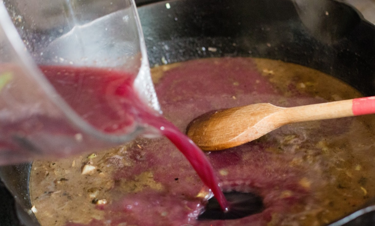 Deglaze the frying pan with the wine, bringing it to the boil while stirring to lift all the browned bits from the bottom of the pan. Pour the mixture immediately over the beef, kidneys and onion. Stir in the thyme, bay leaf, beef stock and tomato purée, and a few drops of Worcestershire Sauce, if using.